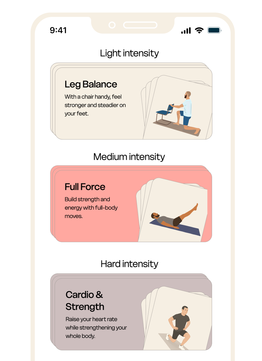 It doesn’t matter how fit you are. You can choose from workouts with different intensity levels, so you can train at your own pace. If you’re unfamiliar with an exercise, read the instructions carefully and start gently.